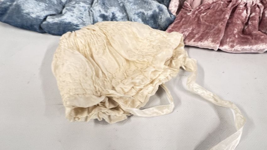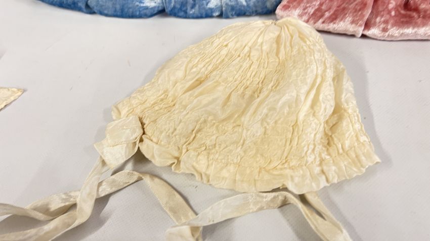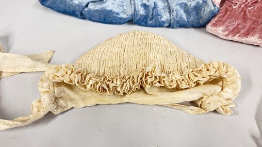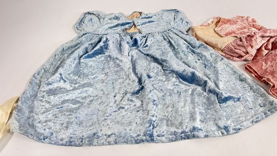 TWO VINTAGE CRUSHED VELVET DRESSES + TWO VINTAGE BONNETS AND A BLUE VELVET CAP.