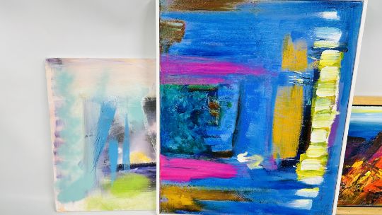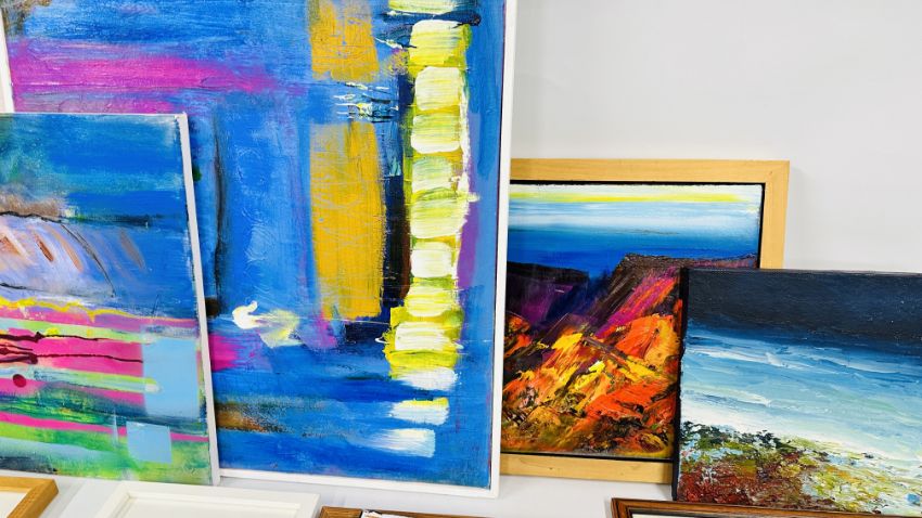 A GROUP OF 3 MODERN ABSTRACT OIL ON CANVAS STUDIES TO INCLUDE AN EXAMPLE TITLED WINDOW SEAT, BEARING SIGNATURE PATRICIA LOMAX + A FURTHER 3 MODERN ABSTRACT OIL STUDIES BEARING SIGNATURE GENNADIY IVONOV + A SET OF 3 FRAMED AND MOUNTED PICTURES TITLED HARBOURSIDE I, II & IV + AN ORIGINAL FRAMED AND MOUNTED OIL ON BOARD TITLED COWSLIP FLOWER SERIES BEARING KIRSTIE STEADMAN ETC.