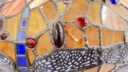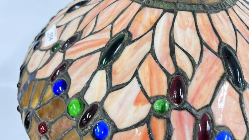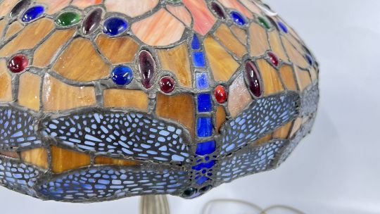 A DECORATIVE TIFFANY STYLE LAMP AND SHADE FEATURING A LEADED GLASS DESIGN WITH DRAGONFLY MOTIFS, W 45CM A/F.