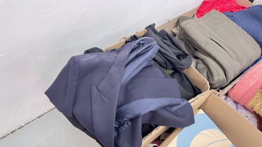 12 BOXES ASSORTED CLOTHING, FOOT WARE, QUILTS, COATS, BLANKETS, GLASSES, SUITCASE ETC TO INCLUDE RIEKER, HENRI LLOYD, CLARKS, BHS, PAVERS, ETC.