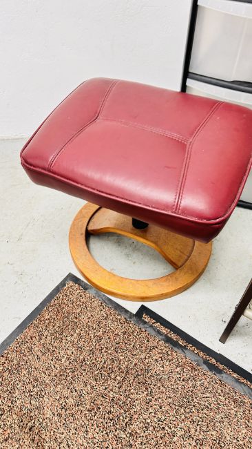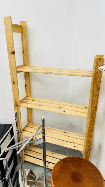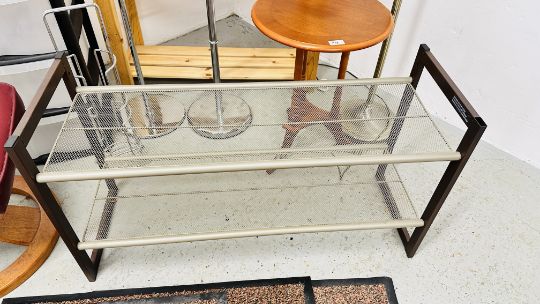 GROUP OF OCCASIONAL FURNITURE TO INCLUDE WOODEN 4 TIER SHELVES, METAL SHOE RACK, 3 X DOOR MATS, BURGUNDY FAUX LEATHER FOOT REST, PLASTIC THREE DRAWER STORAGE CABINET, REPRODUCTION SIDE TABLE, 2 X METAL TOWEL RAILS AND A BRUSHED METAL FLOOR STANDING LAMP - SOLD AS SEEN.