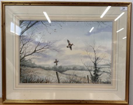 FRAMED AND MOUNTED WATERCOLOUR OF WOODCOCKS IN FLIGHT BY SIMON TRINDER, 37 X 53CM NOT INCLUDING FRAME.