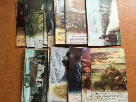 POSTCARDS: WWI ERA BAMFORTH SONG CARDS, PLUS A FEW OTHERS INCLUDING SILK, ALSO AN ALBUM OF CIGARETTE CARDS.