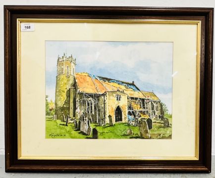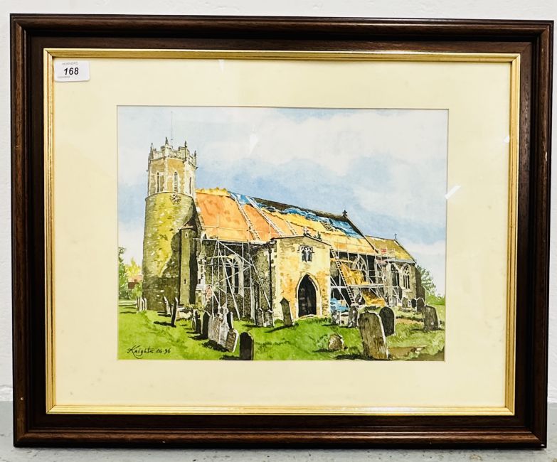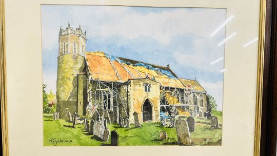 FRAMED AND MOUNTED WATERCOLOUR OF 'ACLE CHURCH UNDER CONSTRUCTION' SIGNED KNIGHTS 96, 49 X 60CM INCLUDING FRAME.