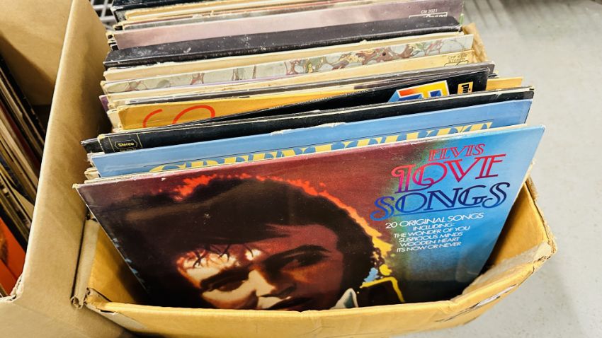 AN EXTENSIVE COLLECTION OF ASSORTED RECORDS TO INCLUDE CLIFF RICHARD, NEIL DIAMOND ELVIS, ABBA, SHAPE OF THE RAIN, CARPENTERS, MOODY BLUES, GENESIS, BEE GEES AND THE BEATLES ETC.