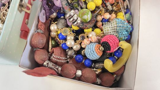 THREE BOXES CONTAINING AN EXTENSIVE GROUP OF ASSORTED COSTUME JEWELLERY BEADED NECKLACES, BANGLES, PENDANTS, EARRINGS AND NECKLACES ETC.