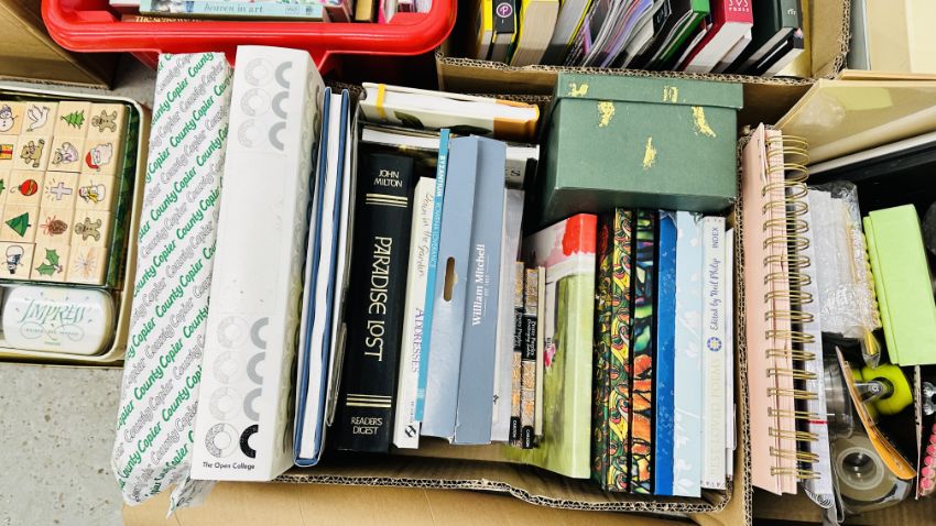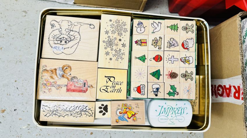8 X BOXES CONTAINING AN EXTENSIVE GROUP OF STATIONERY AND ART EQUIPMENT AND ACCESSORIES, EASEL BOXES ETC. + A BOX OF ASSORTED PRINTING STAMPS.