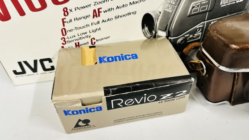 A JVC VIDEOMOVIE GR-AX5BK VHS-C VIDEO CASSETTE, BOXED + AN OLYMPUS CAMEDIA C-760 ULTRA ZOOM DIGITAL COMPACT CAMERA, BOXED + A JVC EVERIO G SERIES HARD DISK CAMCORDER GZ-MG142, BOXED + A KONICA REVIO 22 CAMERA AND A VINTAGE FUJICA 35-EE IN PROTECTIVE CASE - SOLD AS SEEN.