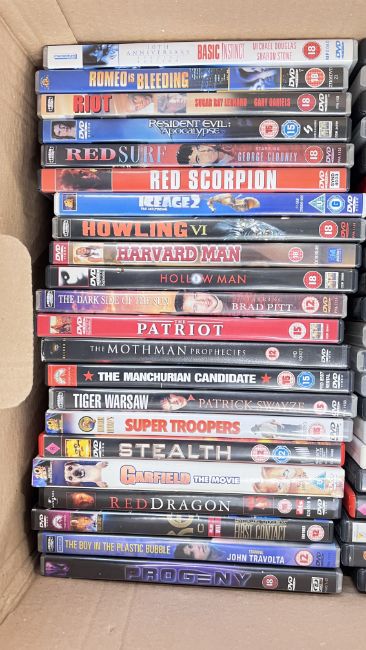 12 X BOXES OF DVD'S, CD'S, RECORDS AND CASSETTES TO INCLUDE INDIANA JONES COMPLETE DVD COLLECTION, 2 X BAND OF BROTHERS COMPLETE SERIES, SHARPE COMPLETE SERIES, LORD OF THE RINGS COMPLETE MOTION PICTURE TRILOGY, AMONG OTHER EXAMPLES, CD'S TO INCLUDE LED ZEPPELIN, QUEEN, MEATLOAF ETC., CASSETTES TO INCLUDE FLEETWOOD MAC, LED ZEPPELIN, STATUS QUO ETC.