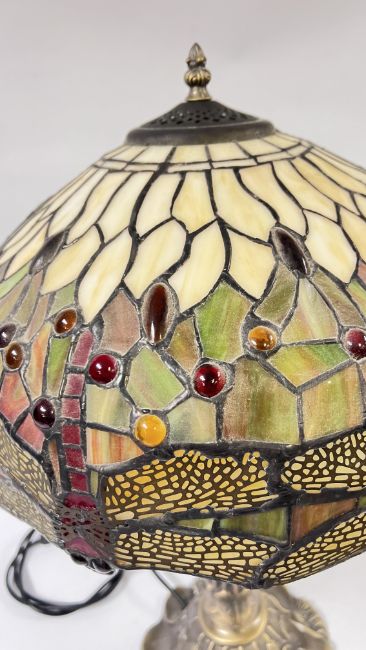 A LARGE REPRODUCTION TIFFANY STYLE TABLE LAMP, THE LEADED SHADE DECORATED WITH DRAGONFLIES, HEIGHT 56CM.