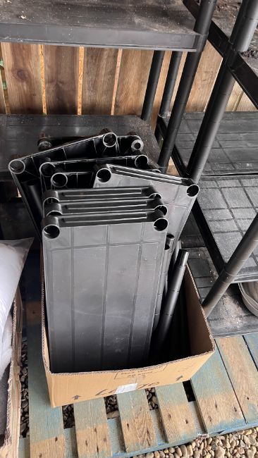 6 BAGS OF BLACK PLASTIC WORKSHOP SHELVING (LARGEST 170CM TALL) PLUS QUANTITY OF FLAT PACK SHELVING COMPONENTS.