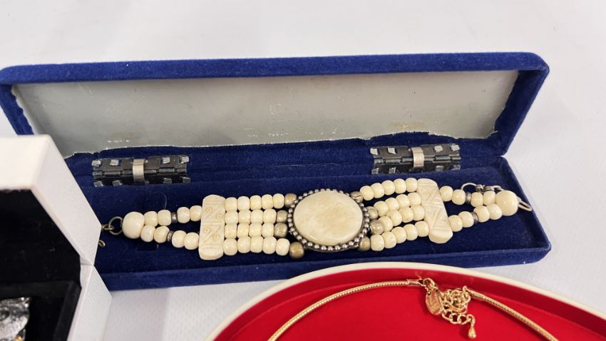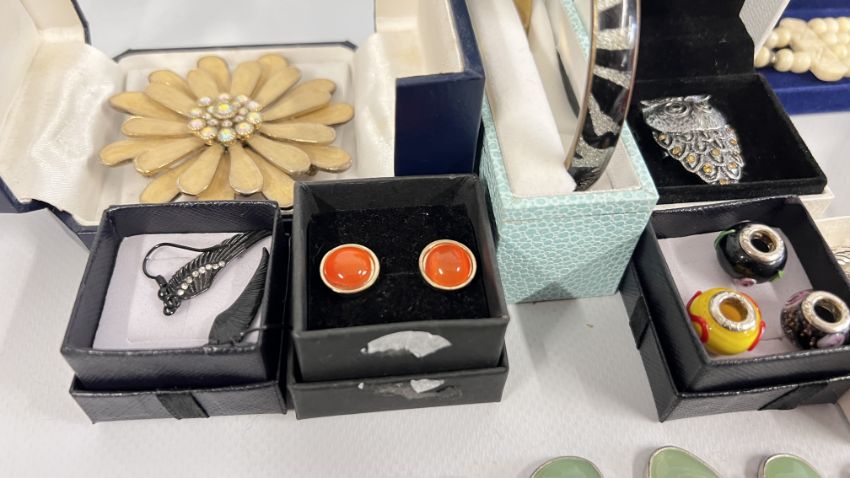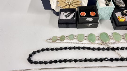 A TRAY OF MIXED SILVER AND COSTUME JEWELLERY TO INCLUDE STONE SET EARRINGS, CHARMS, BANGLES ETC.