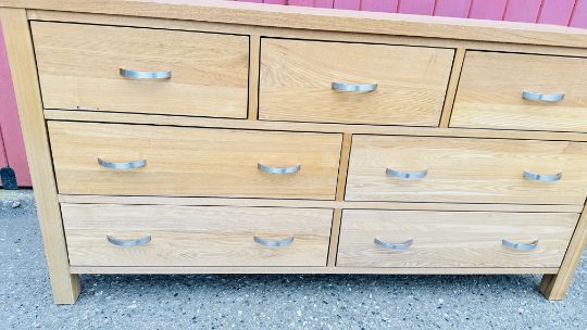 A MODERN SOLID LIGHT OAK SEVEN DRAWER CHEST, W 146CM, D 41CM, H 76CM.