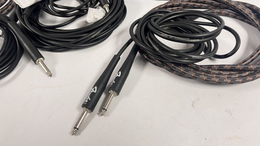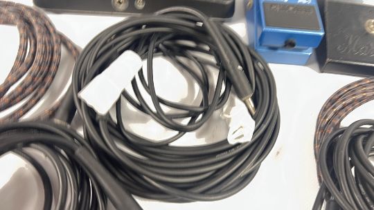 A MARSHALL BLUES BREAKER FOOT PEDAL, A BOSS PITCH SHIFTER DELAY PS-2 GUITAR PEDAL AND AN ORIGINAL CRYBABY MODEL GCB-95 FOOT PEDAL PLUS VARIOUS ASSORTED GUITAR LEADS - SOLD AS SEEN.
