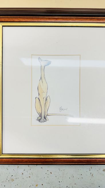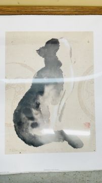 A FRAMED AND MOUNTED LOUIS WAIN PRINT TITLED "THE GOOD PUSS" + A FURTHER THREE CAT RELATED PICTURES.