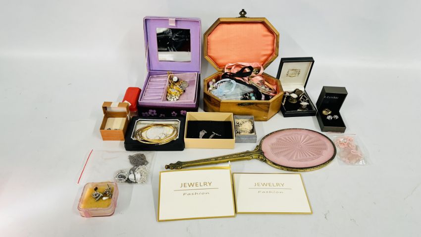 A BOX OF ASSORTED COSTUME JEWELLERY BEADED NECKLACES AND BANGLES, CUFF LINKS FASHIONED FROM COINS, ENAMEL NECKLACES, ETC.