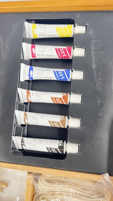 WOODEN TRAVEL EASEL (A/F) ALONG WITH HELD PAINTS AND PAINT BRUSHES.