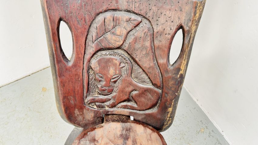 A VINTAGE HARDWOOD AFRICAN CHAIR WITH CARVED ANIMAL DETAIL, H 93CM.