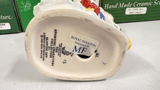 FOUR BESWICK ROYAL DOULTON LIMITED EDITION "THE SPORTING CHARACTERS COLLECTION" STUDIES TO INCLUDE FLY FISHING 88/1500, OUT FOR A DUCK 556/1500, LAST LION OF DEFENCE 800/1500 AND SLOPING OFF 15/1500 (NO CERTIFICATE), IN ORIGINAL PRESENTATION BOXES WITH CERTIFICATES.