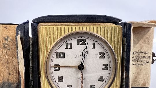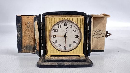 A VINTAGE ART DECO ZENITH TRAVEL CLOCK IN A FITTED LEATHER CASE MARKED REID & SONS A/F.
