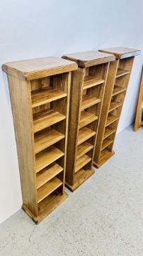 THREE MODERN SOLID LIGHT OAK MEDIA STORAGE TOWERS, EACH W 36CM, D 20CM, H 115CM.