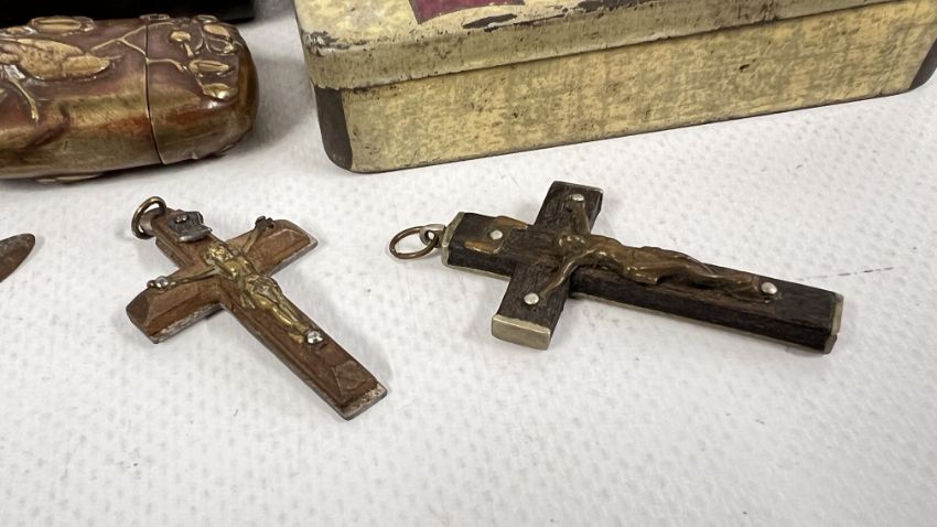 A GROUP OF COLLECTIBLES TO INCLUDE VINTAGE CIGARETTE CARDS, CRUCIFIXES, BAKELITE SNUFF BOX, JAPANESE BRASS EMBOSSED VESTA + A MINIATURE TRENCH ART SPITFIRE MODEL.