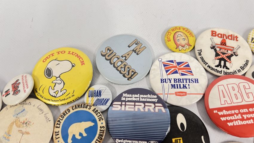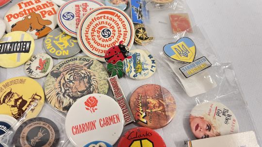 A BOX OF VINTAGE PIN BADGES TO INCLUDE MOTORING RELATED EXAMPLES ETC.