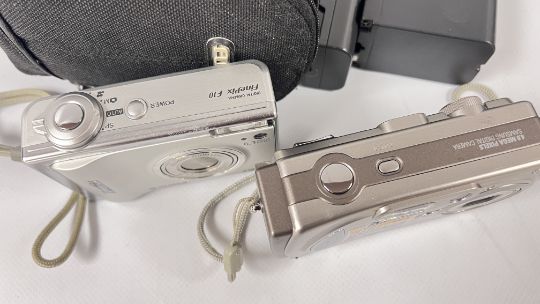A GROUP OF PHOTOGRAPHIC EQUIPMENT TO INCLUDE A TRIPOD, SONY HANDYCAM, CENTON 12 X 50 FIELD BINOCULARS, SAMSUNG AND FUJIFILM DIGITAL CAMERAS ETC. - SOLD AS SEEN.