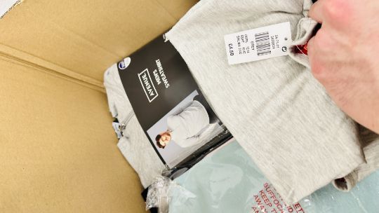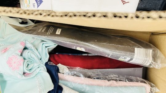 TWO BOXES OF AS NEW CLOTHING TO INCLUDE PYJAMAS, SWEATSHIRTS, INSOLES, TIGHTS, SOCKS, GLOVES ETC.