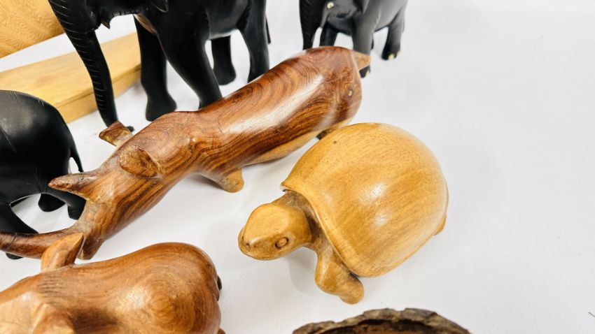 A GROUP OF WOODEN ANIMAL CARVINGS TO INCLUDE A MODEL SAILING BOAT AND TOADSTOOL.