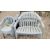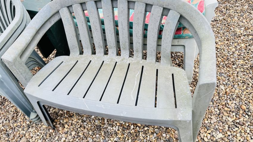 4 GREEN UPVC GARDEN BENCH SEATS - LENGTH 109CM WITH CUSHIONS AND UPVC GARDEN TABLE AND UPVC GARDEN CHAIRS.