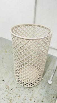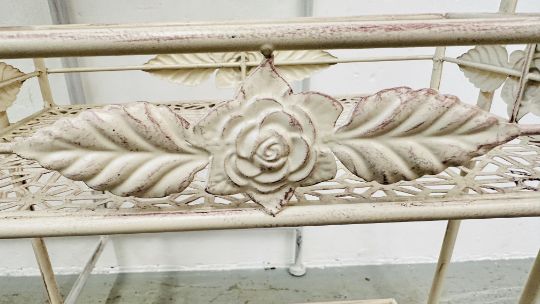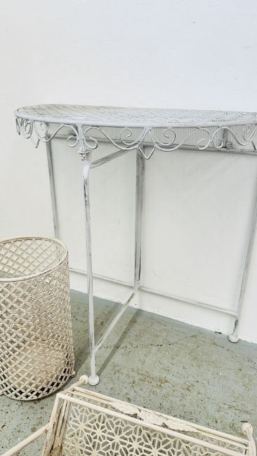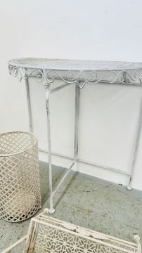 AN ANTIQUE EFFECT DEMI-LUNE METAL CRAFT SIDE TABLE, W 75CM ALONG WITH METAL CRAFT TWO TIER STAND AND METAL CRAFT CYLINDRICAL STICK / UMBRELLA STAND.
