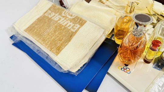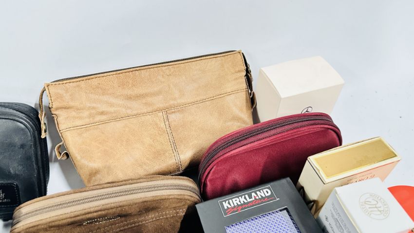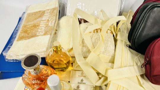 A BOX OF ASSORTED FRAGRANCES AND LOTIONS TO INCLUDE A 4ML COCO CHANEL BOTTLE EMPTY AND PART USED AS CLEARED + 2 X BOXES CONTAINING MAINLY EMIRATES RELATED COSMETIC BAGS, FACE CLOTHS AND PERSONAL HAND TOWELS ETC.