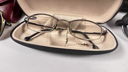 A GROUP OF PRESCRIPTION SUNGLASSES AND READING GLASSES TO INCLUDE DESIGNER BRANDED EXAMPLES + VARIOUS EMPTY CASES.