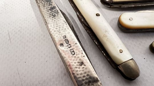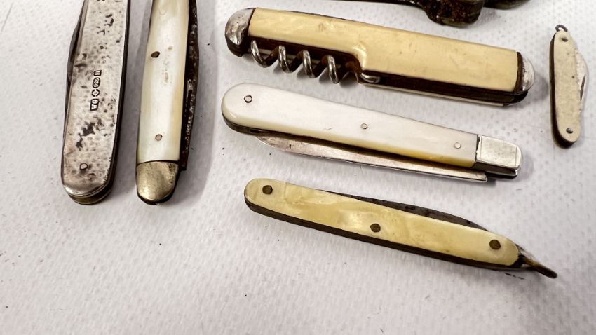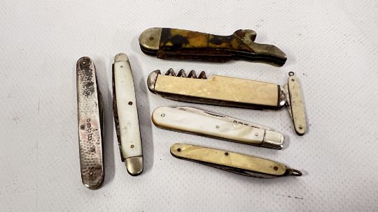 A GROUP OF 7 PEN KNIVES TO INCLUDE SILVER 1907 LONDON MAKER WILLIAM GEIGER, SHEFFIELD 1914, LEG SHAPED ETC.