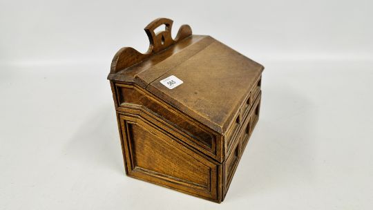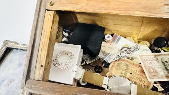 AN OAK DESK TIDY CONTAINING A SILVER PHOTO FRAME A/F, 9CT GOLD SIGNET RING (BROKEN), SEVEN VARIOUS WRIST WATCHES A/F, ODD COINS AND NOTES AND A SMALL GROUP OF COSTUME JEWELLERY.