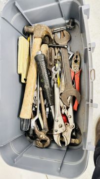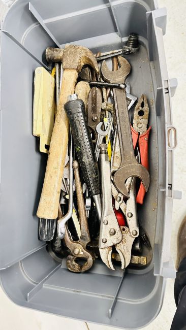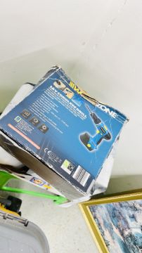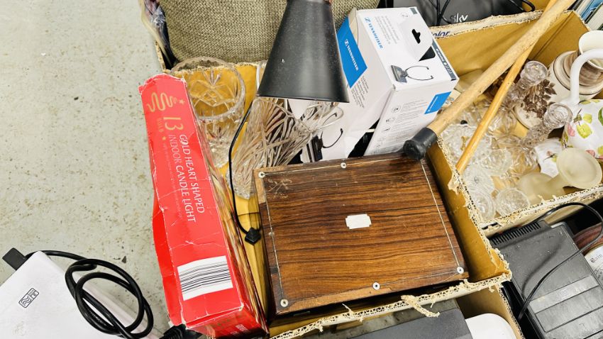 8 BOXES CONTAINING ASSORTED HOUSEHOLD SUNDRIES TO INCLUDE BOOKS, GLASSWARE, DVD'S, WHARFDALE HI-FI, TABLE LAMP, CUSHIONS, CAMERAS, BAROMETER, WALL CLOCK, SKY BOX, AS NEW SHIRTS, WRITING BOX ETC + MICROWAVE OVEN, HP PRINTER, CLOTHES AIRER, PRINTS , TOOL BOX AND CONTENTS, CORDLESS DRILL AND TWO PLASTIC STOOLS.