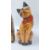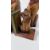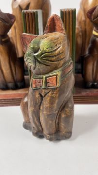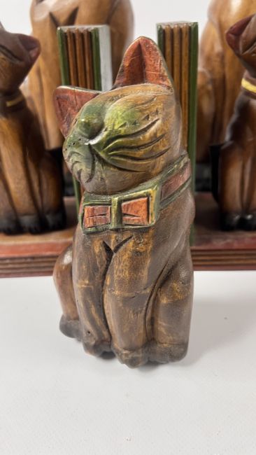 A FAMILY OF 3 CARVED WOODEN CAT SCULPTURE + A PAIR OF SIMILAR BOOKENDS.