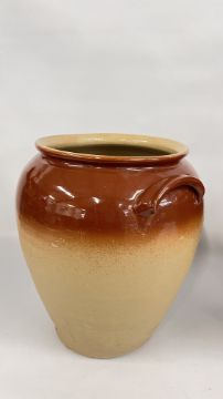 TWO LARGE VINTAGE GLAZED STONEWARE STORAGE CROCK H 43 X H 41CM.
