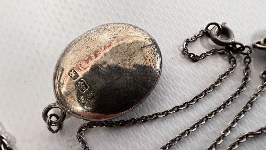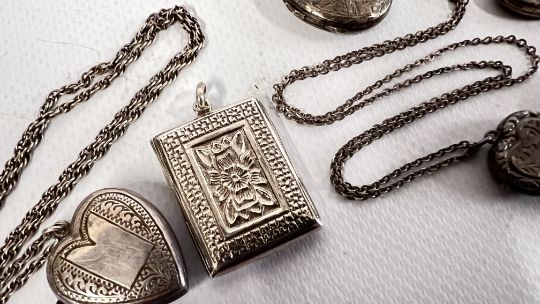 A GROUP OF 7 VINTAGE SILVER LOCKETS SOME WITH CHAINS.