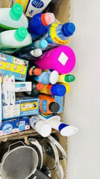 6 BOXES OF ASSORTED KITCHENALIA AND CLEANING CHEMICALS TO INCLUDE POTS AND PANS WITH EXAMPLES TO INCLUDE JUDGE VISTA ETC, ASSORTED CUTLERY, ELECTRICALS TO INCLUDE DAEWOO AND COOKWORKS SLOW COOKER, LLOYTRON KETTLE, MORPHY RICHARDS COFFEE MACHINE, ETC - SOLD AS SEEN.