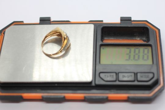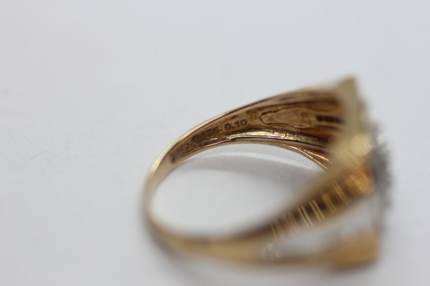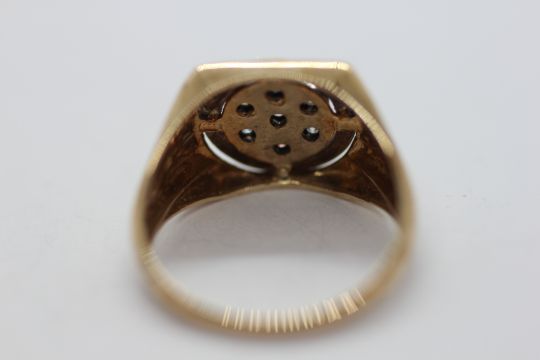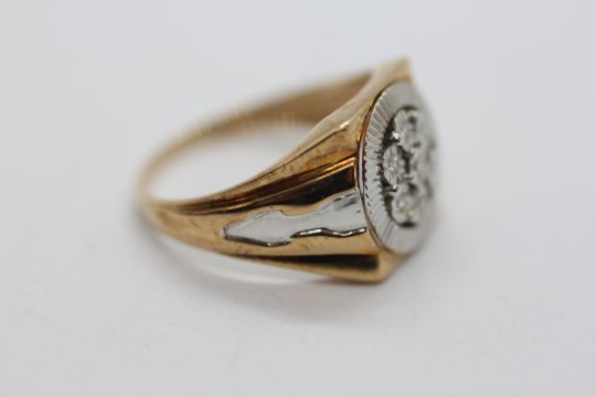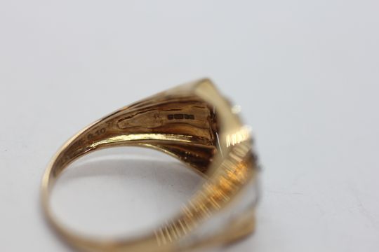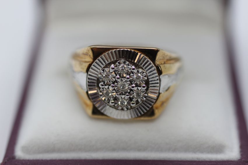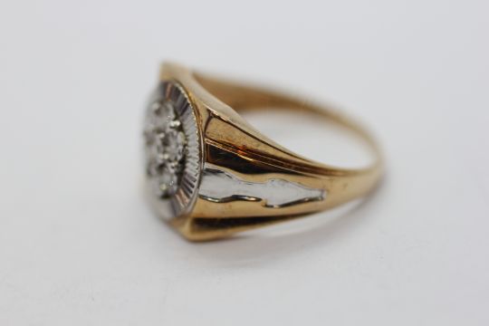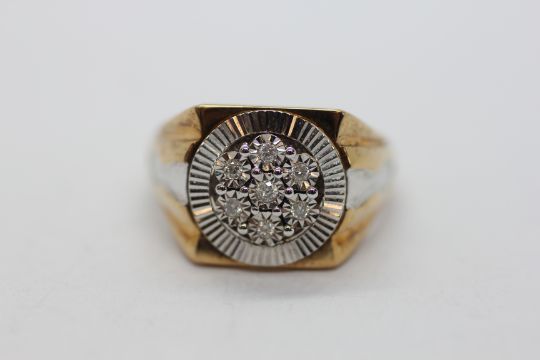 A 9CT GOLD TWO COLOUR MULTI DIAMOND GENTLEMAN'S RING.