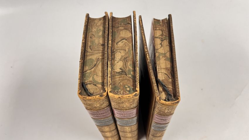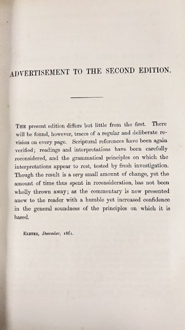 COLLECTION OF 3 VOLUMES BY CHARLES J. ELLICOTT, 1861-3, THESE ARE A COMMENTARY ON ST PAUL'S EPISTLES. BOUND IN FULL LEATHER MATCHING PRIZE BINDING, WITH GILT EMBLEMS TO THE BOARDS, AND MARBLED ENDPAPERS AND CLOSED EDGES. RED AND BLACK MOROCCO PLATES TO SPINES ALL PRESENT.