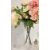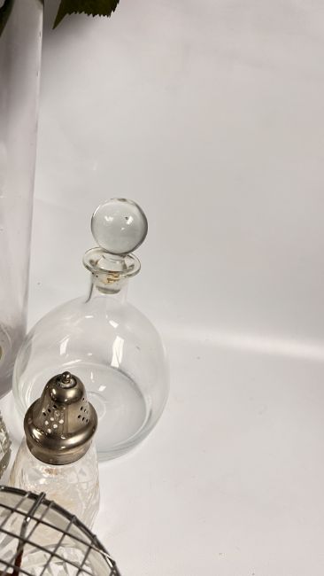 A GROUP OF GOOD QUALITY GLASS WARE TO INCLUDE A PAIR OF CANDLESTICKS, DECANTER AND ROSE BOWL + VARIOUS VASES TO INCLUDE A LARGE CLEAR GLASS EXAMPLE CONTAINING ARTIFICIAL FLOWERS ETC.