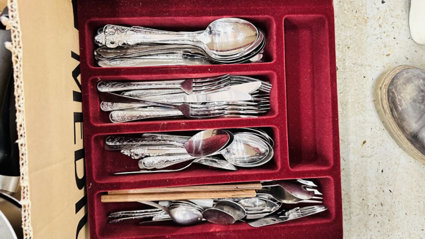 9 X BOXES OF ASSORTED KITCHENALIA TO INCLUDE POTS, PANS, TRAYS, PYREX AND GLASS DISHES AND BOWLS, ASSORTED CLEANING CHEMICALS AND PERSONAL CLEANING PRODUCTS. KITCHEN ELECTRICALS TO INCLUDE MORPHY RICHARDS 4 SLOT TOASTER, SILVER CREST AIR FRYER, GENER8 HAND HELD STEAM CLEANER, HAND HELD VACUUM CLEANER, MIXED BULBS, ETC.