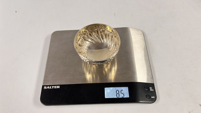 A SMALL SILVER EMBOSSED BOWL, LONDON 1902, RUBBED MAKERS MARK, DIAMETER 8.5 X HEIGHT 5.5CM.