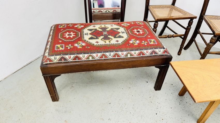 A MODERN DARK STAINED CHEVAL MIRROR WITH BEVELLED PLATE GLASS + TWO RATTAN SEATED BEDROOM CHAIRS + A LARGE MAHOGANY FRAMED FOOTSTOOL WITH HAND EMBROIDERED CUSHION SEAT + A SMALL MAHOGANY RECTANGULAR COFFEE TABLE WITH UNDER TIER.
