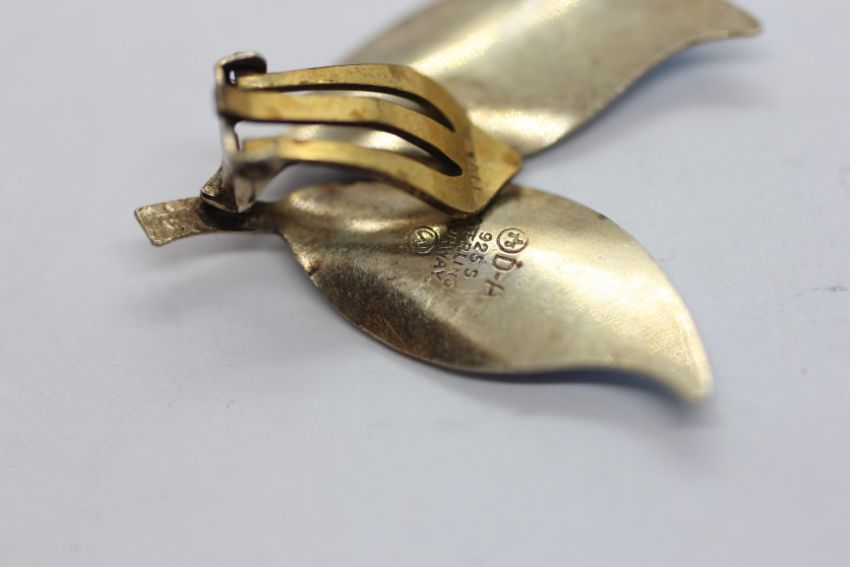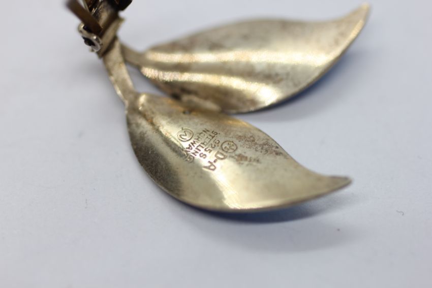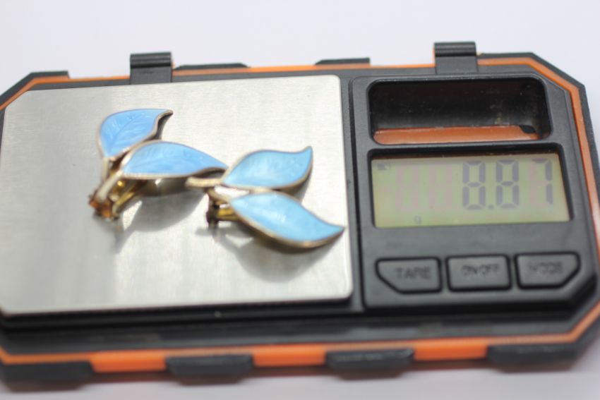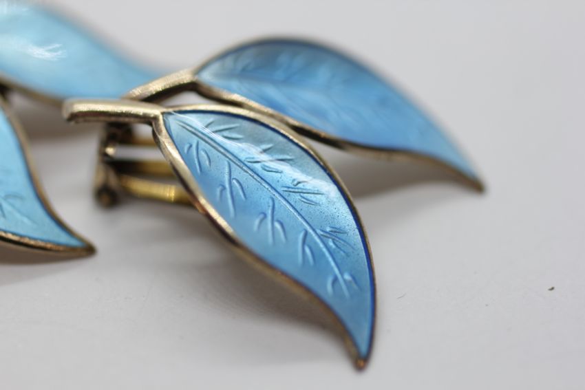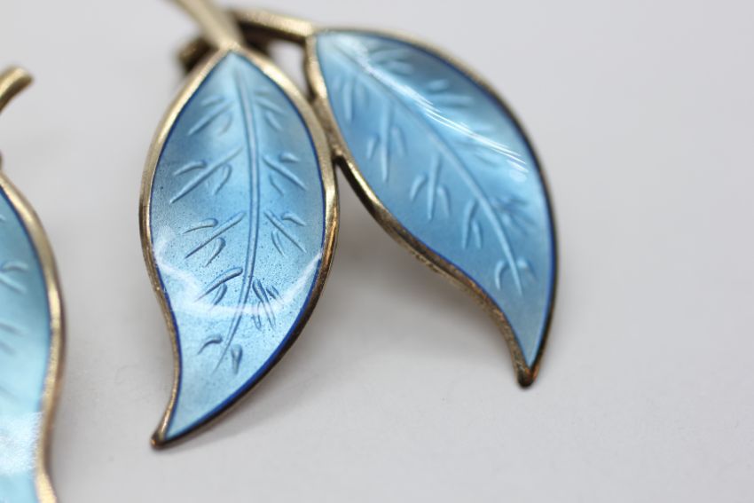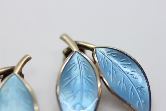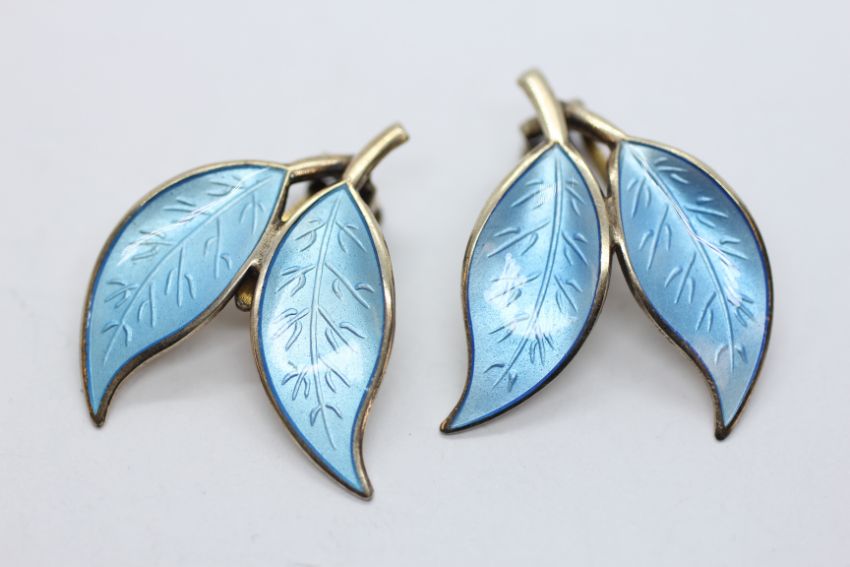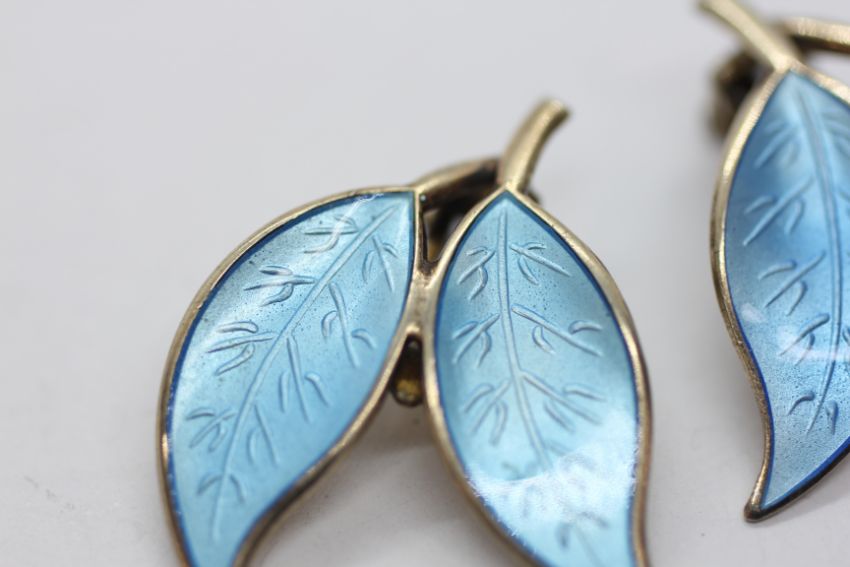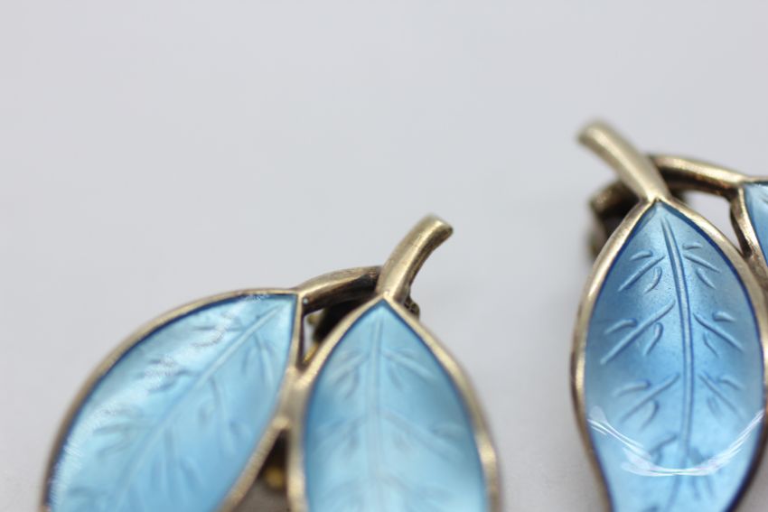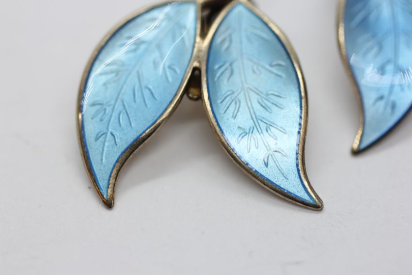 A PAIR OF DAVID ANDERSON NORWEGIAN SILVER GILT AND BABY BLUE ENAMEL LEAF DESIGN CLIP ON EARRINGS.