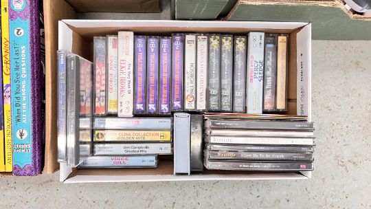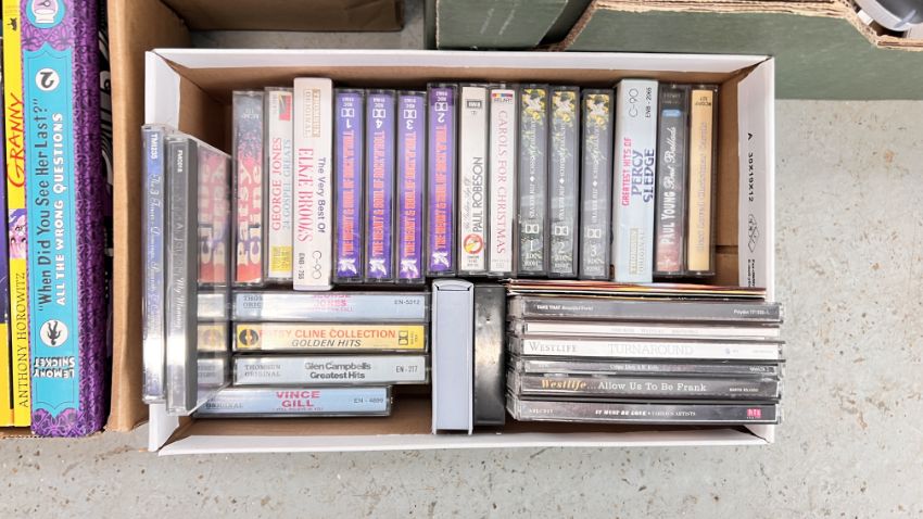 9 X BOXES OF ASSORTED HOUSEHOLD SUNDRIES TO INCLUDE CHINA AND GLASS WARE, BOOKS, CD'S AND CASSETTES, WALL CLOCKS, ELECTRICALS TO INCLUDE LAMPS, PAPER SHREDDER, ROBERTS RADIO (NO CABLE), SANYO CD PLAYER (NO CABLE), ETC - SOLD AS SEEN.