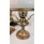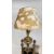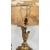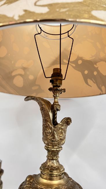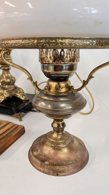 A PAIR OF VINTAGE REEDED COLUMN COPPER FILLED LAMP BASES, BRASS OIL LAMP WITH A WHITE GLASS SHADE, AN ITALIAN GILDED URN FASHIONED AS A LAMP BASE WITH SHADE AND A GILDED CHERUB CENTRE PIECE.